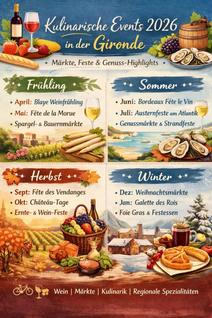 - Marchés de Noël (Weihnachtsmärkte) – regionale Winter-Märkte mit Foie Gras, lokalen Weinen, Gebäck & Spezialitäten in Bordeaux und vielen Gemeinden.